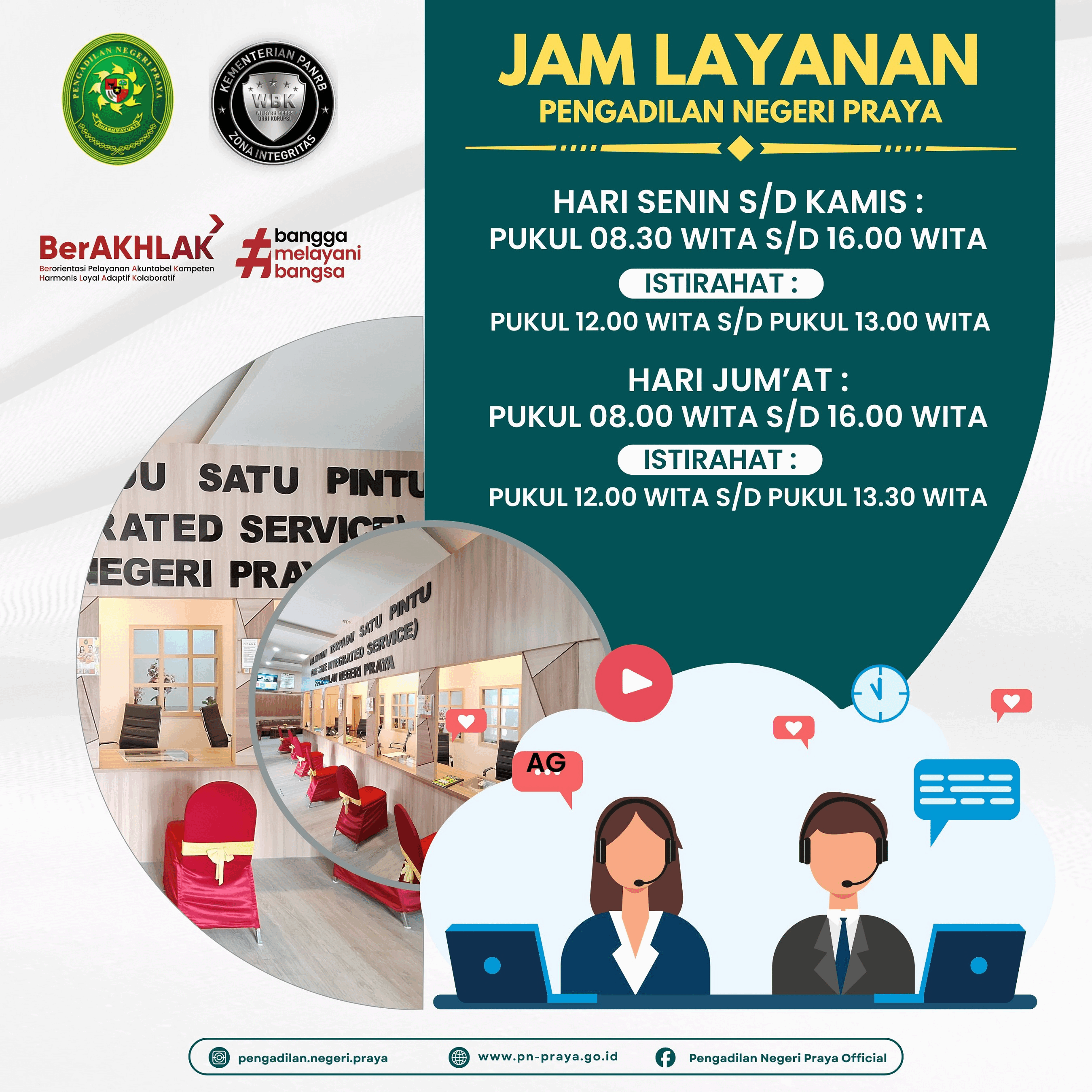 MOTTO PN PRAYA : PRO AKTIF (PROfesional, Akuntabel, Kreatif, Taqwa, InovatiF) - PN PRAYA Telah Melakukan Pencanangan Pembangunan Zona Integritas Untuk Mempertahankan Predikat Wilayah Bebas Korupsi (WBK) dan Mewujudkan Wilayah Birokrasi Bersih Melayani (WBBM) pada pengadilan Negeri Praya - Mohon Bantu Kami Dengan Tidak Memberikan Apapun Kepada Petugas Kami Atas Pelayanan Yang Anda Terima, Pelayanan Prima...Hak Anda...Kewajiban Kami     Pengadilan Negeri Praya Telah Membuka Loket Pelayanan Pada Mal Pelayanan Publik Lombok Tengah Beralamat Di Jalan Gajahmada Leneng, Praya Kabupaten Lombok Tengah - Layanan Yang Tersedia Antara Lain : Informasi Peradilan, Pengajuan Surat Keterangan Tidak Berperkara Secara Elektronik Melalui Aplikasi Eraterang, dan Pengajuan Izin Besuk dan Izin Pinjam Pakai Barang Bukti Melalui Aplikasi e-Berpadu.
